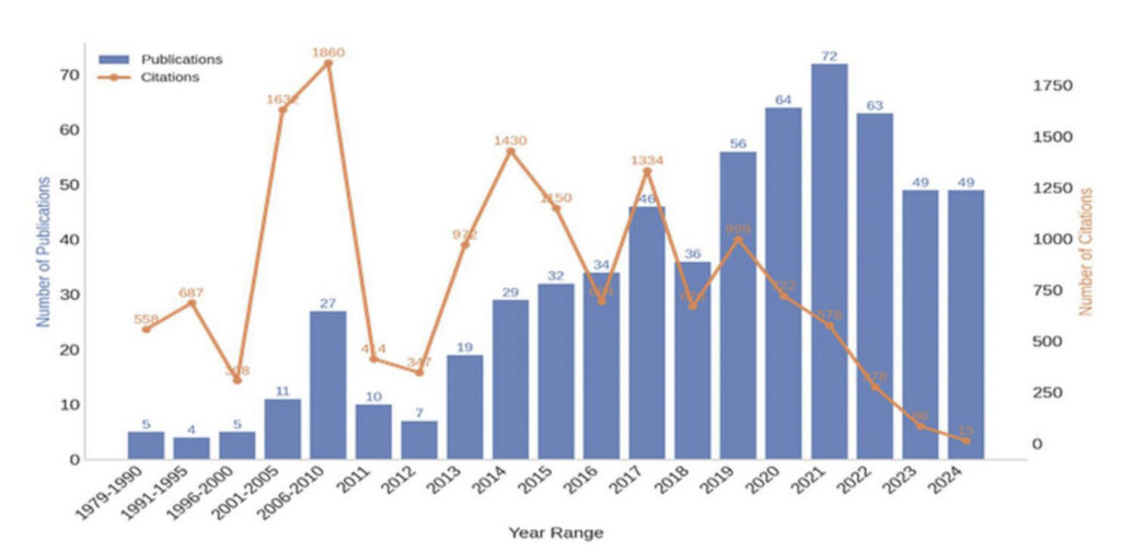 Another large bibliometric study examining publications from 1979 to 2024 identified 618 scientific documents and more than 14,700 citations related to dry needling and myofascial trigger points.The analysis revealed that early research output was limited, with only a handful of publications appearing between 1979 and the early 1990s. However, after 2010, the number of studies increased substantially, reflecting the growing clinical adoption of dry needling within rehabilitation sciences, physical therapy, sports medicine, and pain management.