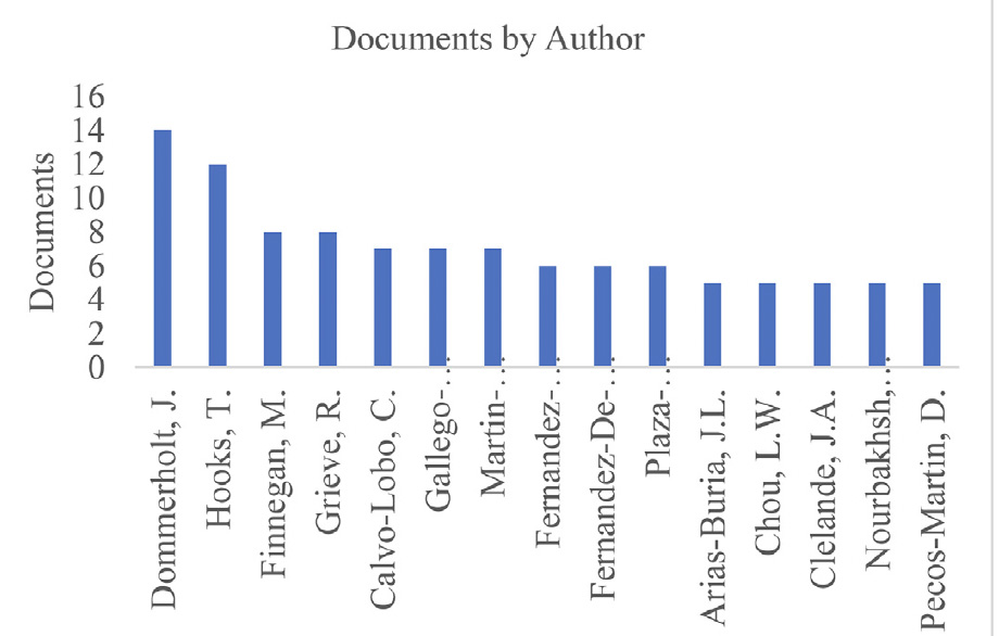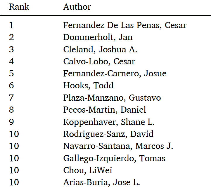 The most productive author was Cesar Fernández-de-las-Peñas with 48 publications and over 1,300 citations. Jan and Cesar have published several articles and textbooks together, including the world’s ranking dry needling textbook, “Dry needling; an evidenced and clinical-based approach. 3rd ed. 2026, Edinburgh: Churchill Livingstone.”